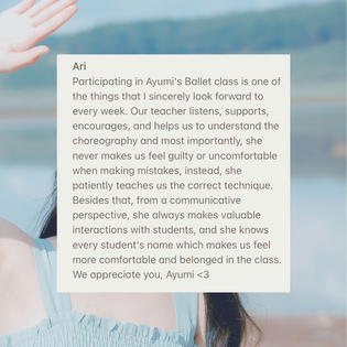 Participating in Ayumi's Ballet class is one of the things that I sincerely look forward to every week. Our teacher listens, supports, encourages, and helps us to understand the choreography and most importantly, she never makes us feel guilty or uncomfortable when making mistakes, instead, she patiently teaches us the correct technique. Besides that, from a communicative perspective, she always makes valuable interactions with students, and she knows every student's name which makes us feel more comfortable and belonged in the class. We appreciate you, Ayumi <3